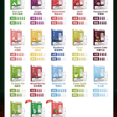 葡萄, 西瓜, 百香果, 荔枝, 蜜桃, 鳳梨, 芭樂, 青蘋果, 哈密瓜, 藍莓, 鐵觀音, 檸檬茶, 寶礦力, 凍檸可樂, 沙士, 薄荷, 綠豆, 龍井, 冰棍, 南極冰, 蔓越莓, 水梨, 莓果, 奇異果, 芒果, 煙草